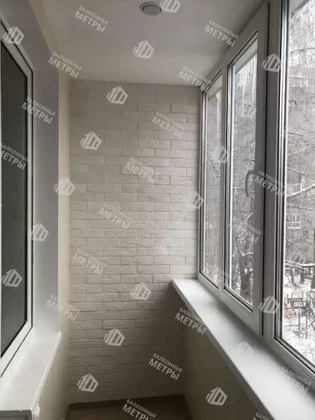 Отделка балкона декоративным камнем, ламинат и натяжной потолок